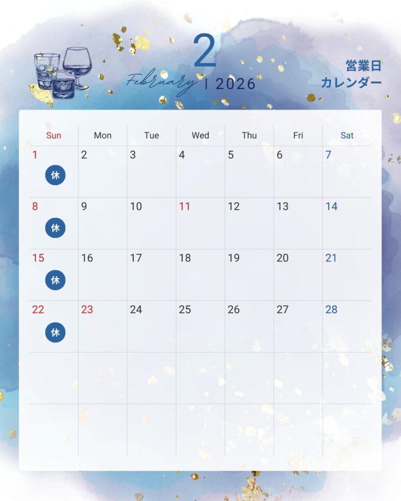 【2026年 2月】営業日カレンダー 2026年01月26日2026年01月14日 三浦屋 三浦屋, 鹿児島, 出水 バレンタインデー ちょっとイイお酒はいかがですか? 【2026年 2月の営業日カレンダー】 *営業時間 9:00~19:00 *定休日 日曜日 祝日(11日、23日)も通常通り営業致します 2月といえば…「バレンタインデー」🍫💕 特別な日には、ちょっとイイお酒で大切な人とのひと時を過ごしてみては? バレンタインのギフトも承ります!